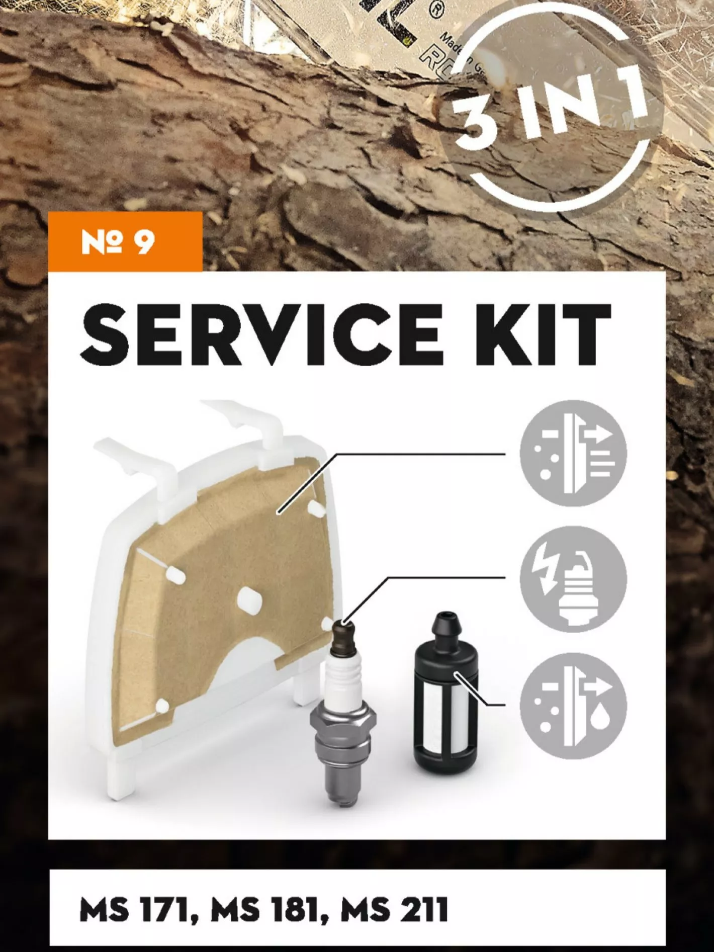 SERVICE KIT 9, MOOTTORISAHOILLE MS 171, MS 181, MS 211 Käytännöllinen huoltosetti STIHL koneellesi sisältää sytytystulpan, ilmansuodattimen ja polttoainesuodattimen. Polttomoottorikäyttöisiin... Lue lisää