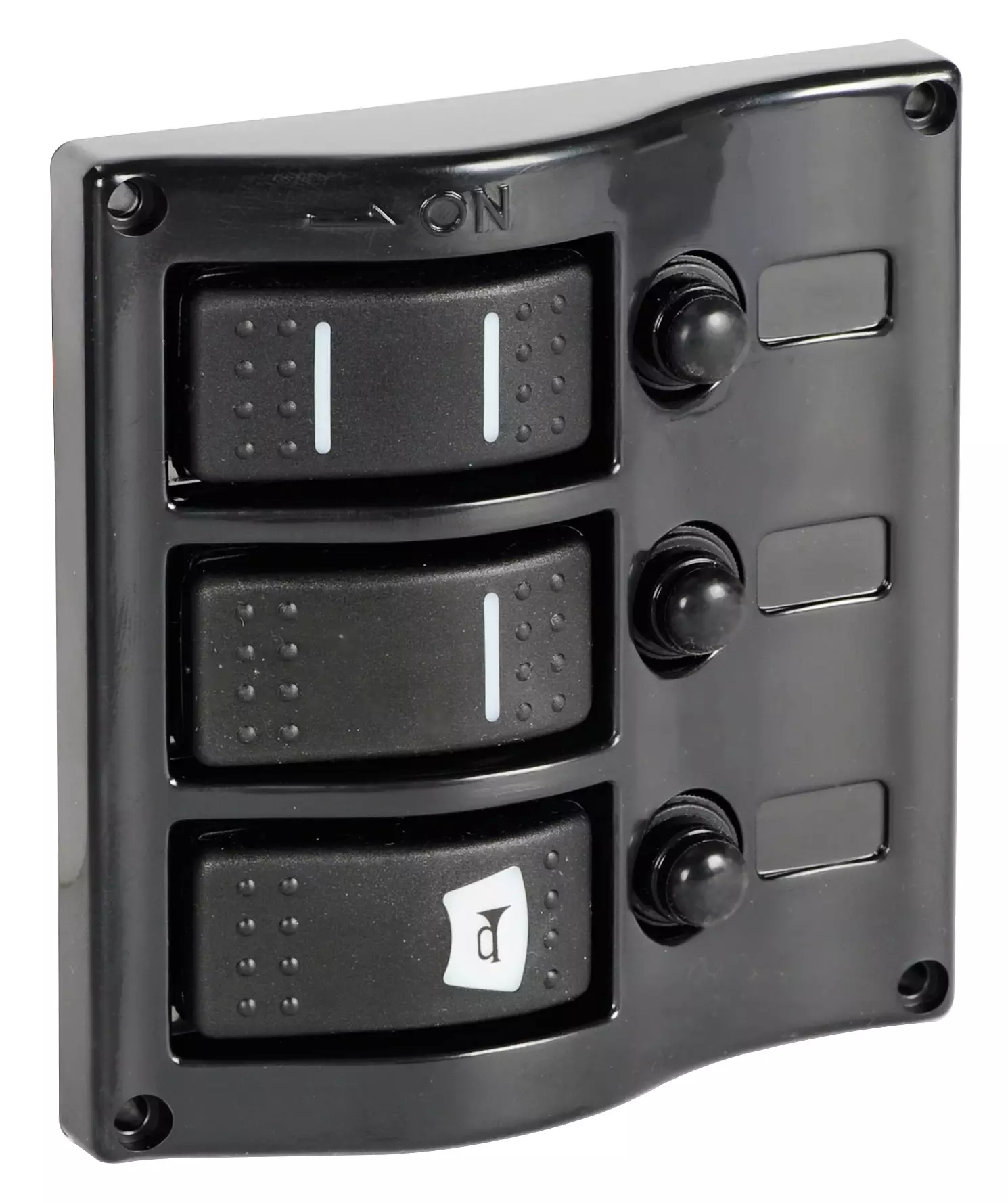 M14-196-01 kytkimet Automaattiset sulakkeet (resetoitavat) Väri: Musta Sulakkeet: 1kpl 5A / 1kpl 10A / 1kpl 15A Mitat: 124x115mm Vesitiiviit kytkimet (kpl): 3