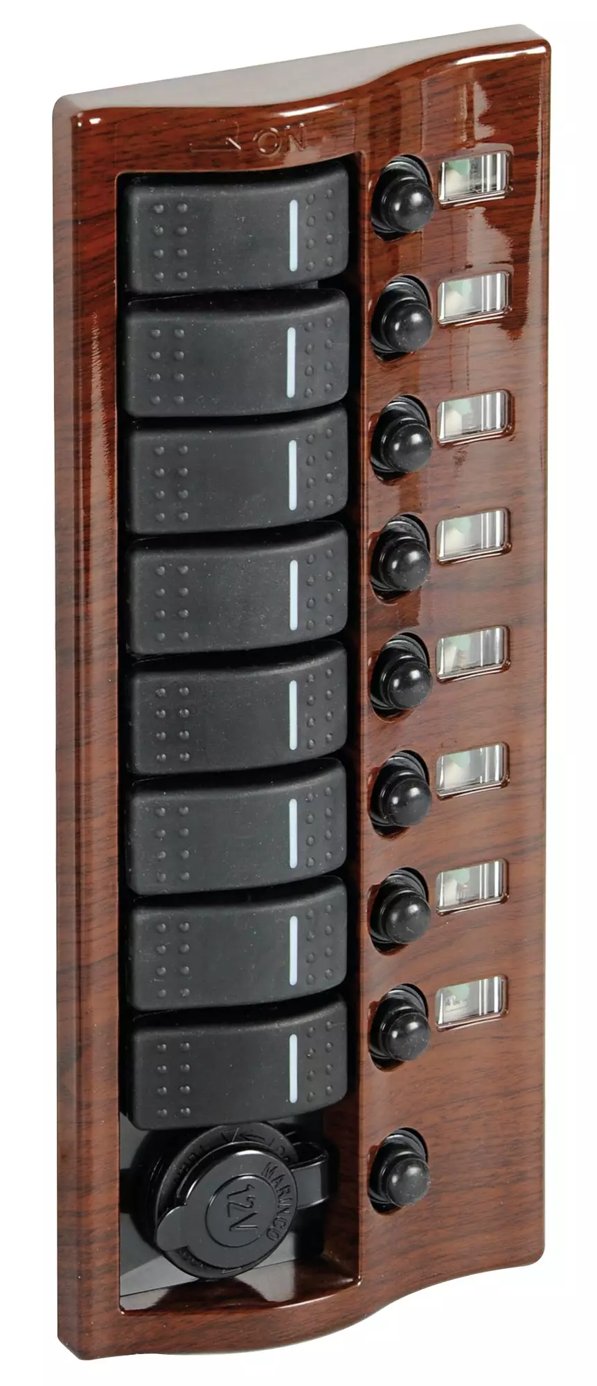 M14-196-01 kytkimet Automaattiset sulakkeet (resetoitavat) Väri: Mahonki Sulakkeet: 2kpl 5A / 5kpl 5A / 2kpl 15A Mitat: 280x115mm Vesitiiviit kytkimet (kpl): 8 + 12V