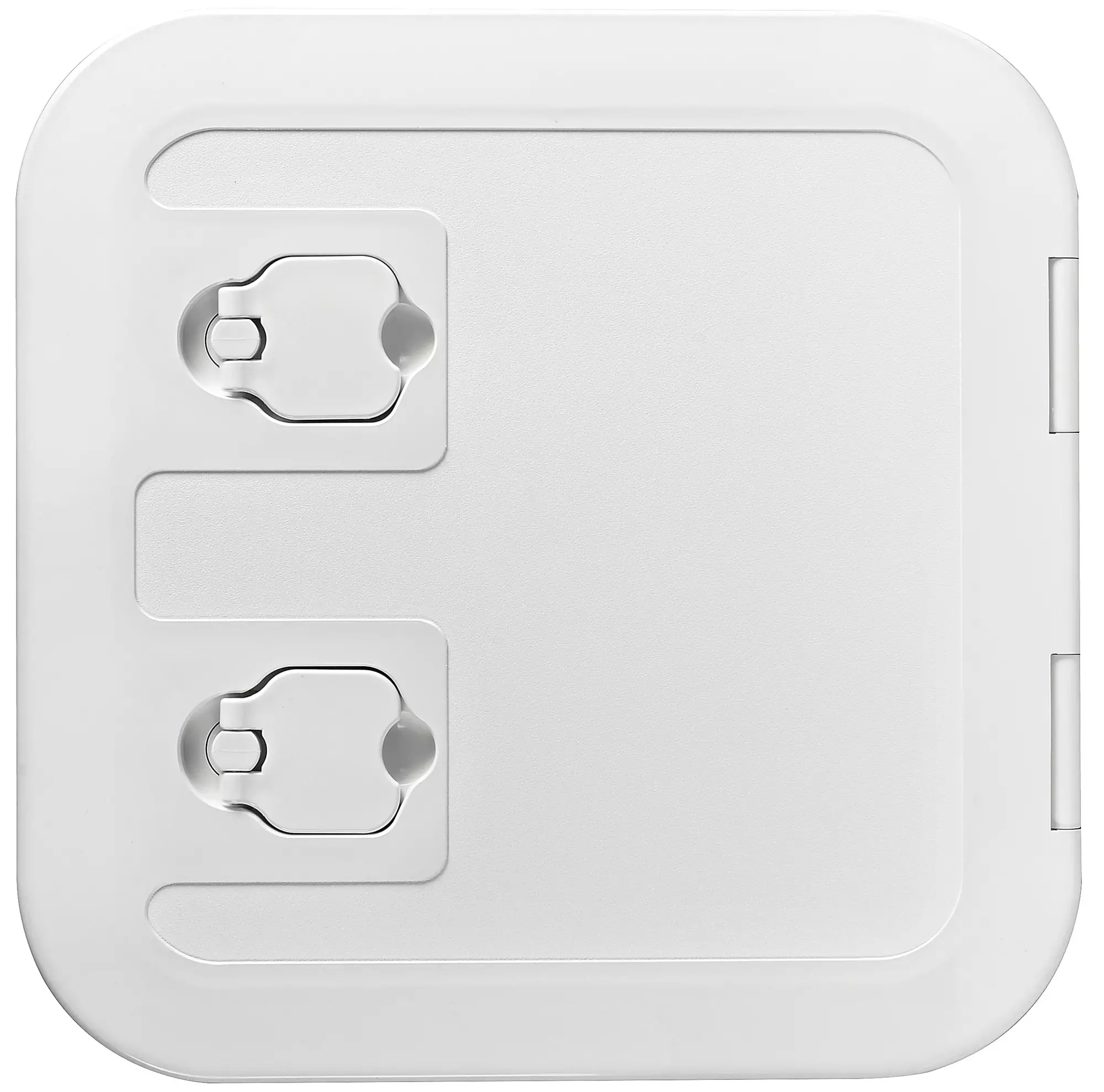 The faired cover hides the frame completely; flush hinges; 180° opening; walking surface. UV BASF resistant. Outside: 375x375mm Inside: 285x285mm Cut: 300x300mm